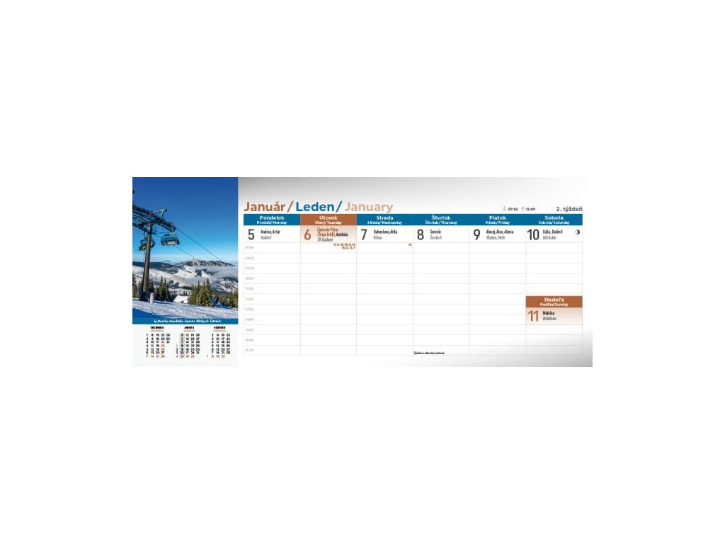 Spoznajte krásy Slovenska prostredníctvom stolového kalendára Slovensko. Týždňový stĺpcový kalendár s hodinovým delením, daňovými pripomienkami, fázami Mesiaca, východmi a západmi Slnka, štátnymi sviatkami všetkých krajín EÚ, školskými prázdninami, slovenskými a českými menami (plus netradičné mená).