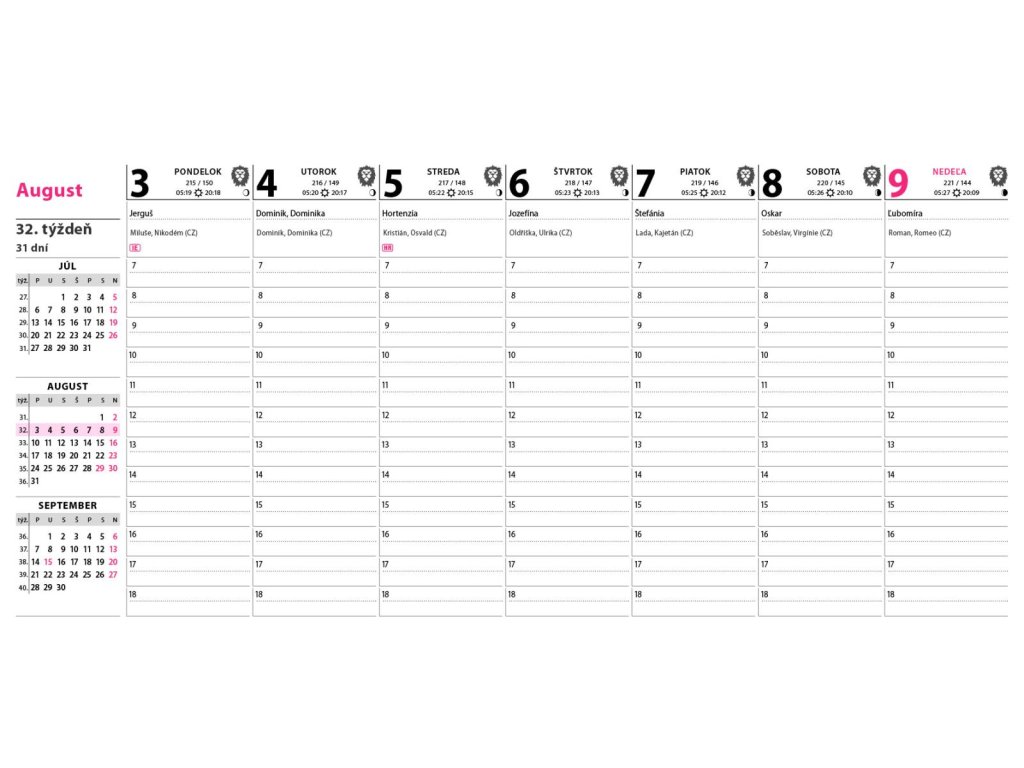 Praktický stĺpcový kalendár s prehľadom najbližších mesiacov na ľavej strane. Dostatok miesta na plánovanie celého týždňa. Obsahuje dane, sviatky v EU, východy a západy slnka, fázy mesiaca.