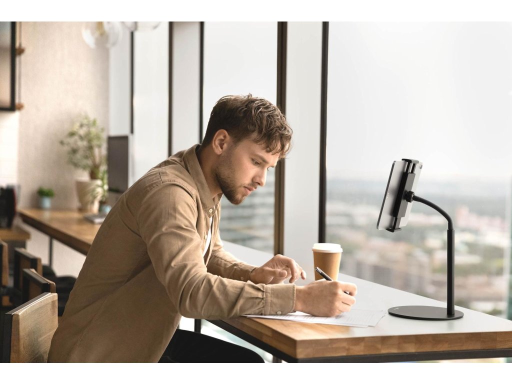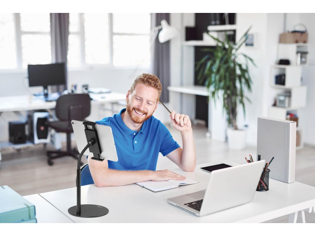 Stojan na stôl pre tablety a mobilné telefóny od 4,7-13`. Plynulá otočnosť a nastavenie výšky pomocou flexibilného ramena.