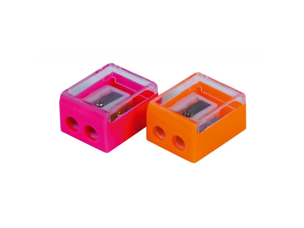 Dvojité plastové strúhadlo so zásobníkom na štandardné a farebné ceruzky. Dodávané v mixe farieb bez možnosti výberu konkrétnej farby. Väčšie balenie 40 ks.