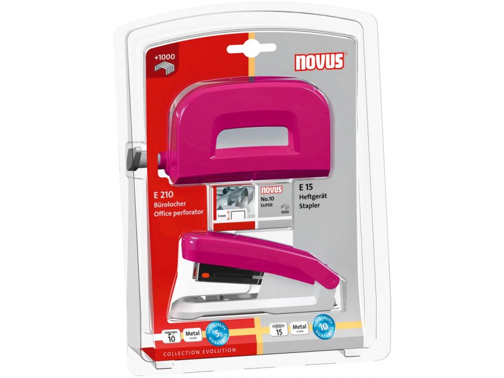 Súprava kancelárskych produktov obsahuje zošívačku Novus E 15, dierovačku Novus E 210 a spinky No.10 SUPER. Farba ružová.