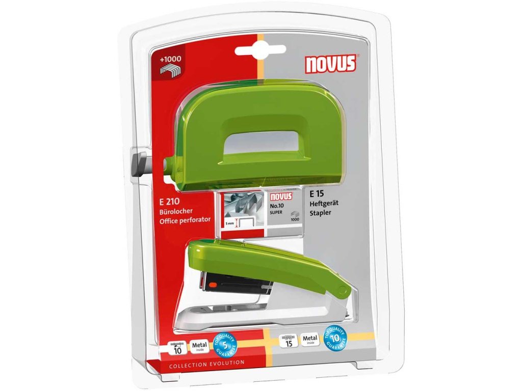 Súprava kancelárskych produktov obsahuje zošívačku Novus E 15, dierovačku Novus E 210 a spinky No.10 SUPER. Farba zelená.