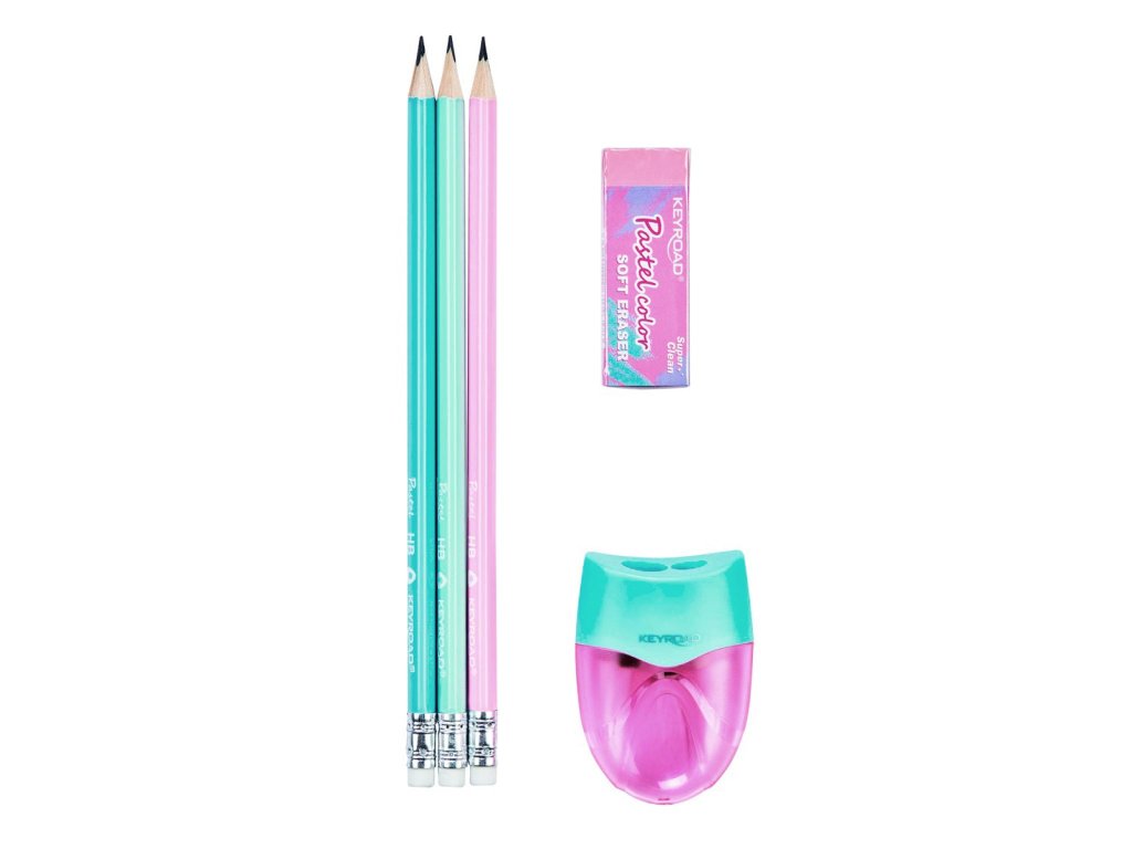 Súprava pastelových grafitových ceruziek KEYROAD, 5 ks: grafitová ceruzka trojuholníková, s gumou 3 ks, strúhadlo plastové dvojité, s nádobkou 1 ks, mäkká guma 1 ks. Balenie: blister. Farba: mix farieb.