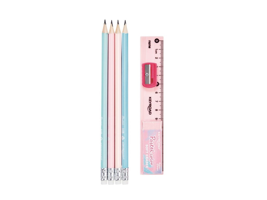 Súprava školských pomôcok KEYROAD, 7 ks: pastelová grafitová ceruzka, trojuholníková, s gumou - 4 ks, strúhadlo plastové 1 ks, mäkká guma 1 ks, plastové pravítko 20 cm 1 ks. Balenie: blister. Farba: mix farieb.