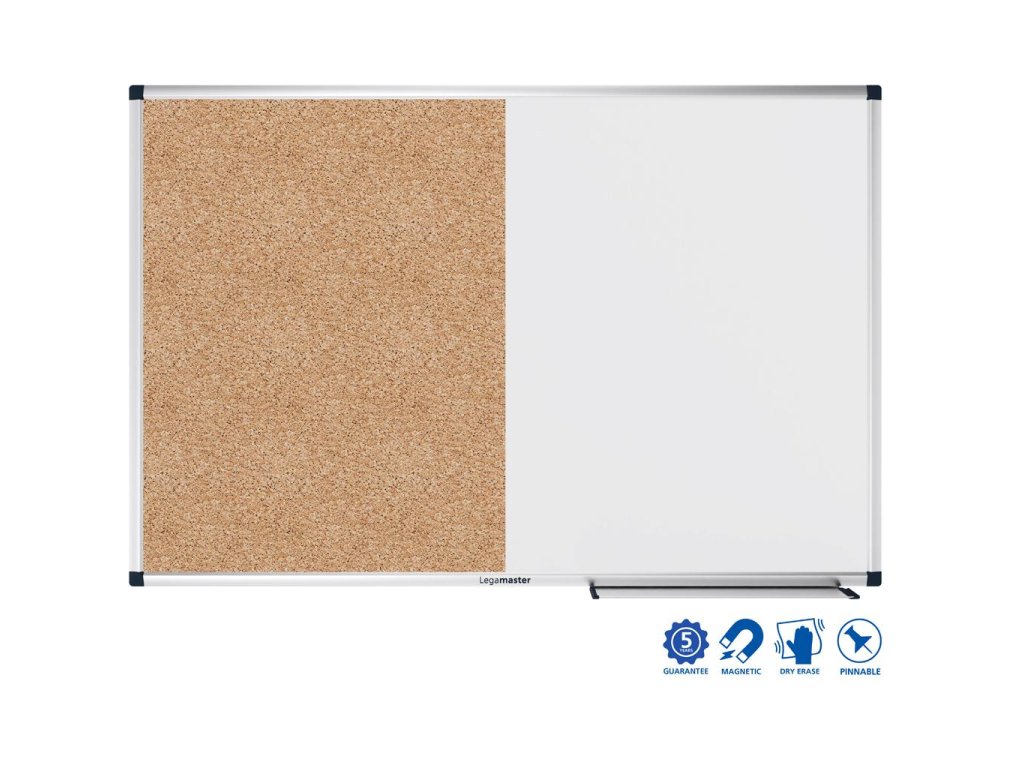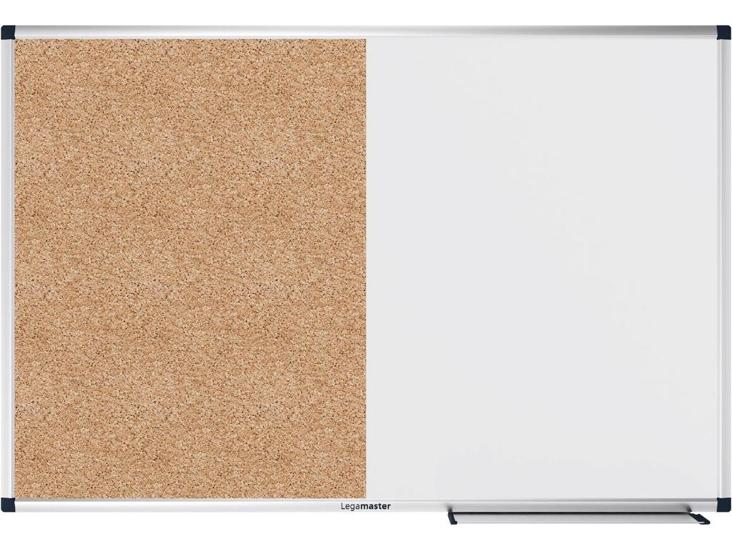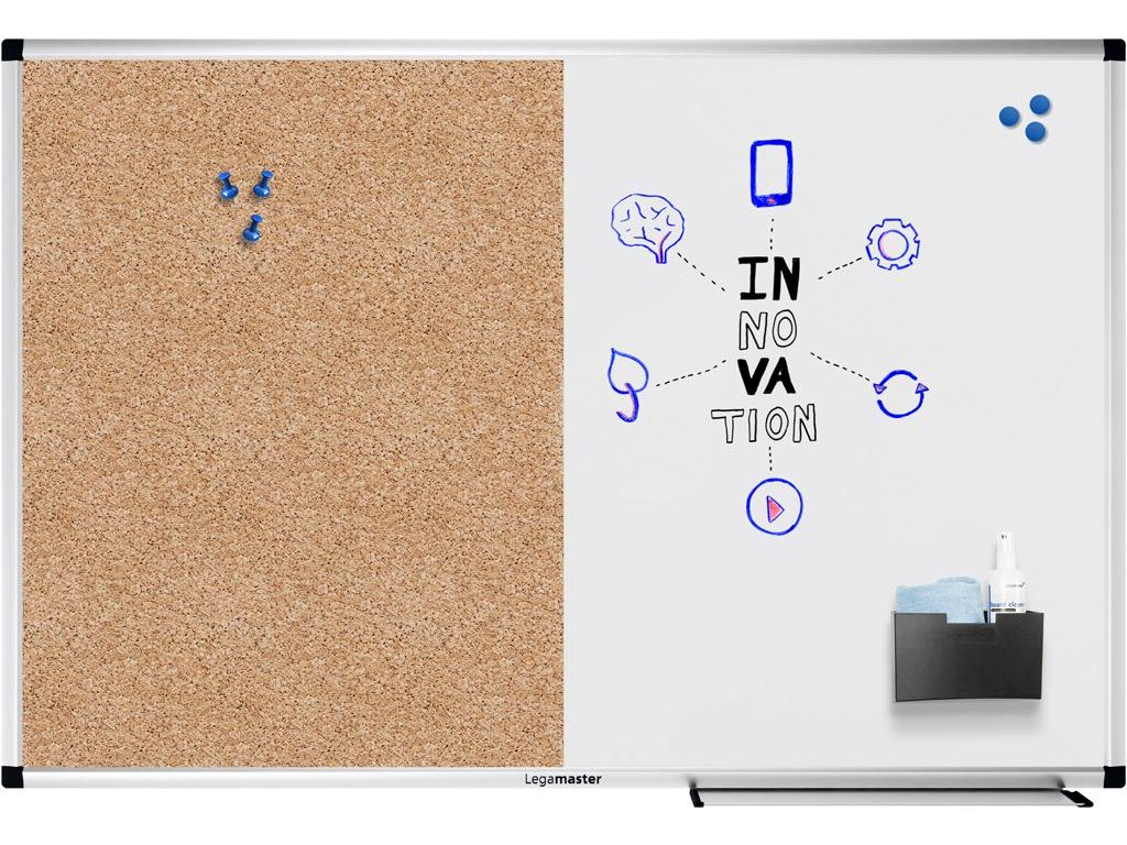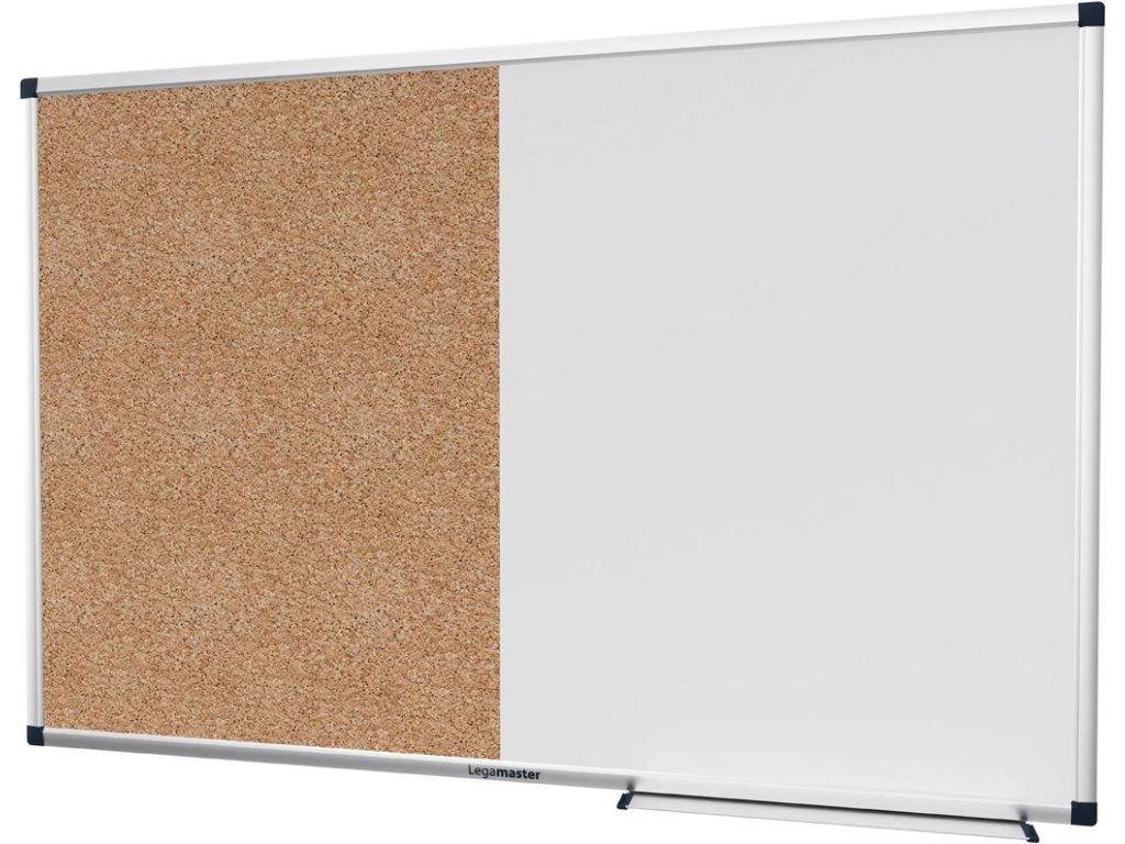 Kombinácia korkovej nástenky a bielej tabule v jednom ráme na príležitostné použitie v kancelárii alebo domácej kancelárii. Jedna polovica: Magnetická lakovaná oceľová tabuľa vhodná na popisovanie za sucha stierateľnými popisovačmi na tabuľu. Druhá polovica: Nástenka s povrchom z prírodného korku. Hliníkový rám so sivými plastovými rohovými krytkami (Pantone