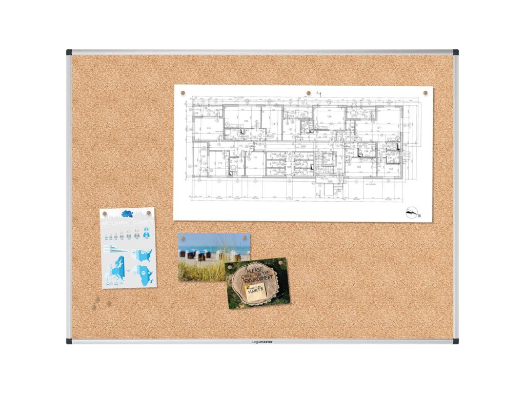 Robustná korková tabuľa na časté používanie. Korok spoľahlivo zakryje prepichnuté otvory. Ekologický povrch vyrobený z materiálu z dobre obhospodarovaných lesov s certifikátom FSC®. Hliníkový rám so sivými plastovými rohovými krytkami. Jednoduchá montáž horizontálne alebo vertikálne. Vrátane montážnej sady a montážneho návodu. Rozmer 90x120 cm.