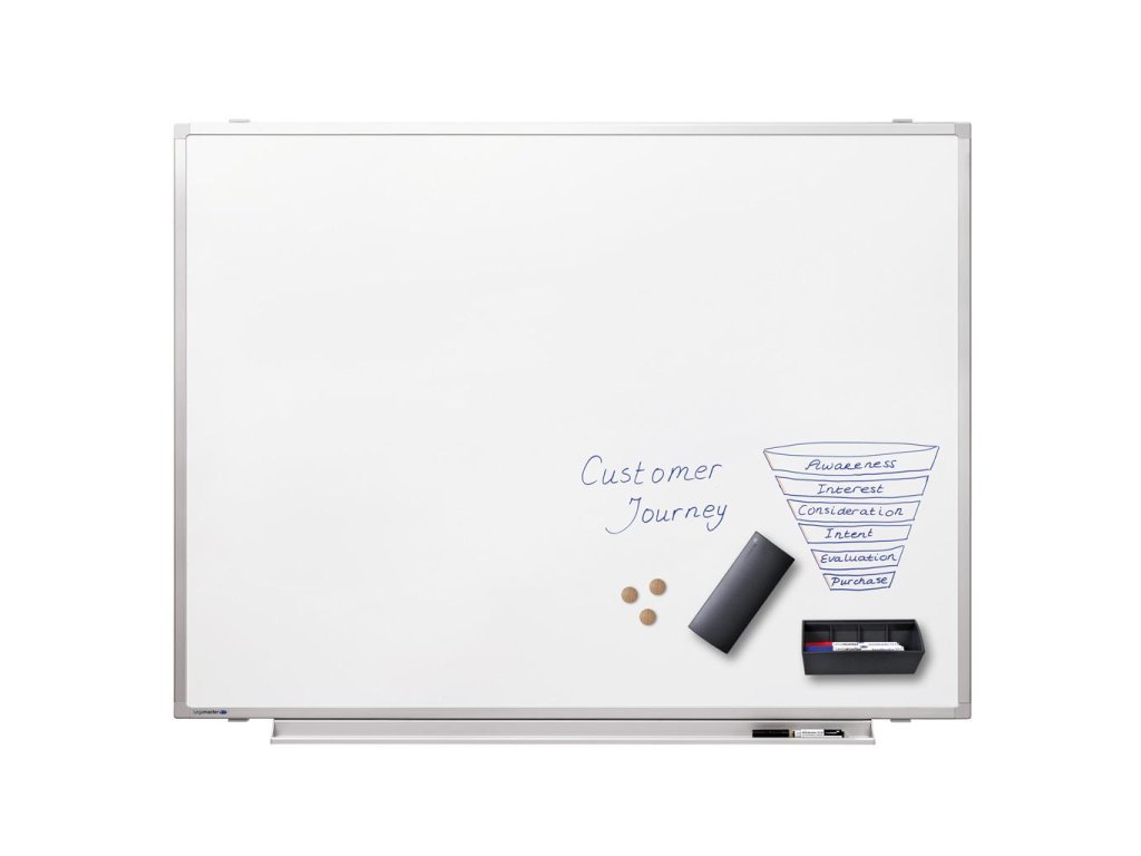 Biela tabuľa s keramickou úpravou povrchu. Odľahčená, ale veľmi pevná a hrubá vnútorná výstuž. Odolný magnetický povrch, vhodný na popisovanie za sucha stierateľnými popisovačmi. Veľmi jednoduché stieranie atramentu aj po dlhšom čase. Kvalitný povrch umožňuje odstrániť atrament aj z nesprávne použitého popisovača (napr. permanentného) bez poškodenia povrchu. Zvlášť vhodná na frekventované a dlhodobé používanie (seminárne miestnosti, učebne a pod.). Hliníkový rám so svetlosivými rohovými spojkami z plastu. Montáž na výšku alebo šírku. Dodávaná s montážnou sadou, odkladacou lištou a popisovačom.