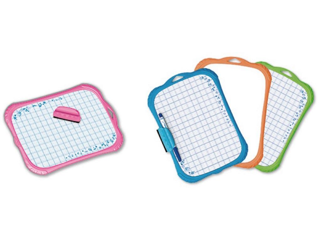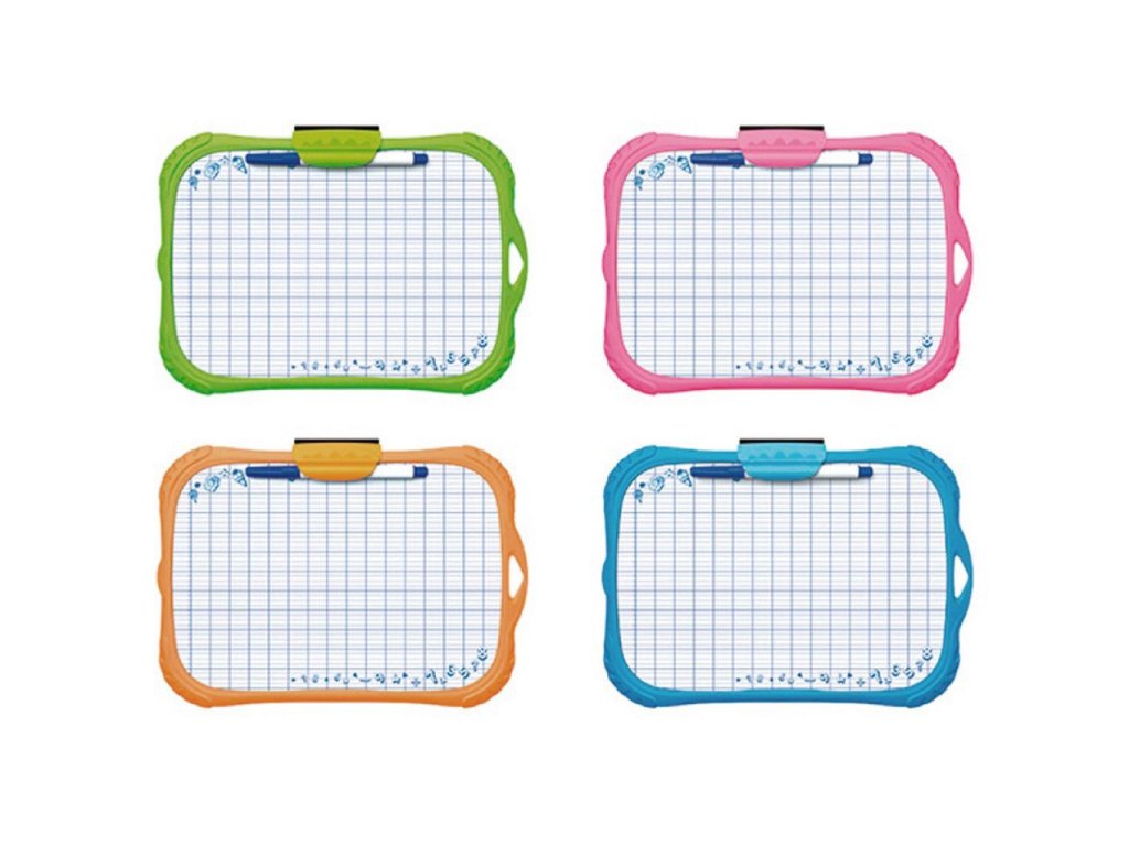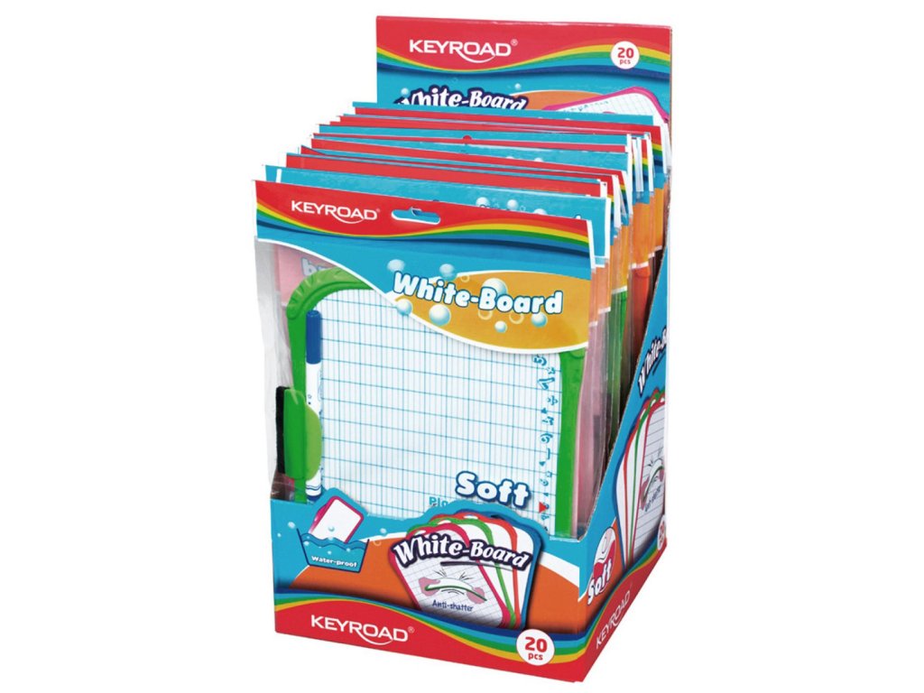 Tabuľka KEYROAD Mini na sucho stierateľná, obojstranná (hladká/kockovaná). Protipráskavý náter, flexi, umývateľný, farebné gumené rámy. Fixka a mini hubka súčasťou balenia. Závesná konzola, rozmer: 205 x 287 x 17mm. Farba dosky: biela, farba rámu: mix farieb.