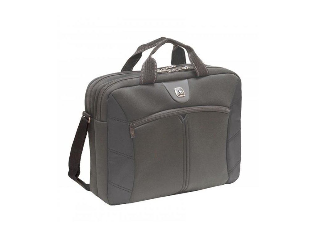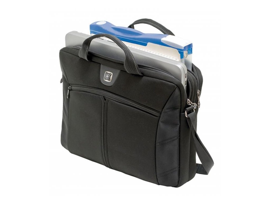 Taška s dvomi priehradkami na notebook a príslušenstvo s nastaviteľným a odolným ramenným popruhom, spevneným ergonomickým madlom a systémom na uchytenie pre kolieskovú batožinu s výsuvným držadlom. Materiál polyester a vinyl. Farba čierna, hmotnosť 0,62 kg. Rozmery (š × v × h) 410 × 320 × 60 mm.