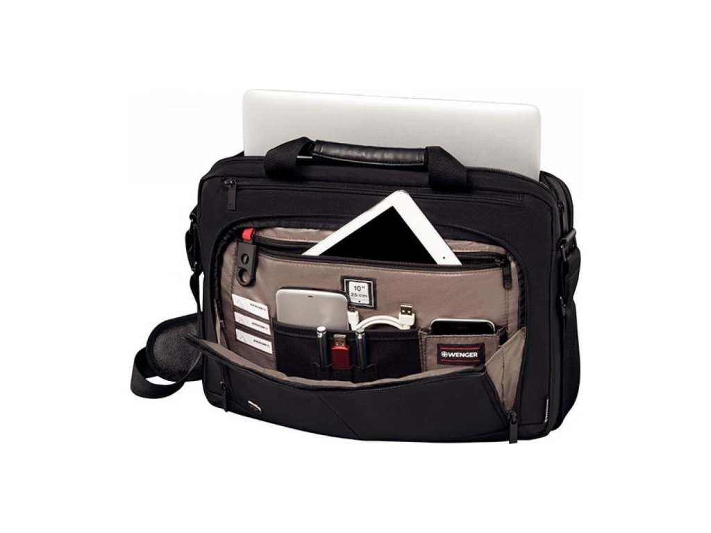 Taška s komfortne nastaviteľným ramenným popruhom, spevneným ergonomickým madlom a systémom na uchytenie pre kolieskovú batožinu s výsuvným držadlom perfektne ochráni notebook pred nárazmi. Vnútorný priestor je účelne členený a obsahuje napríklad oddelenú časť na dokumenty. Organizér udrží všetko potrebné príslušenstvo dokonale usporiadané a ľahko prístupné, vrecko iPad Pocket poslúži na uloženie tabletu alebo čítačky. Materiál polyester, PVC a nylon, farba čierna. Rozmery (š × v × h) 410 × 280 × 120 mm.