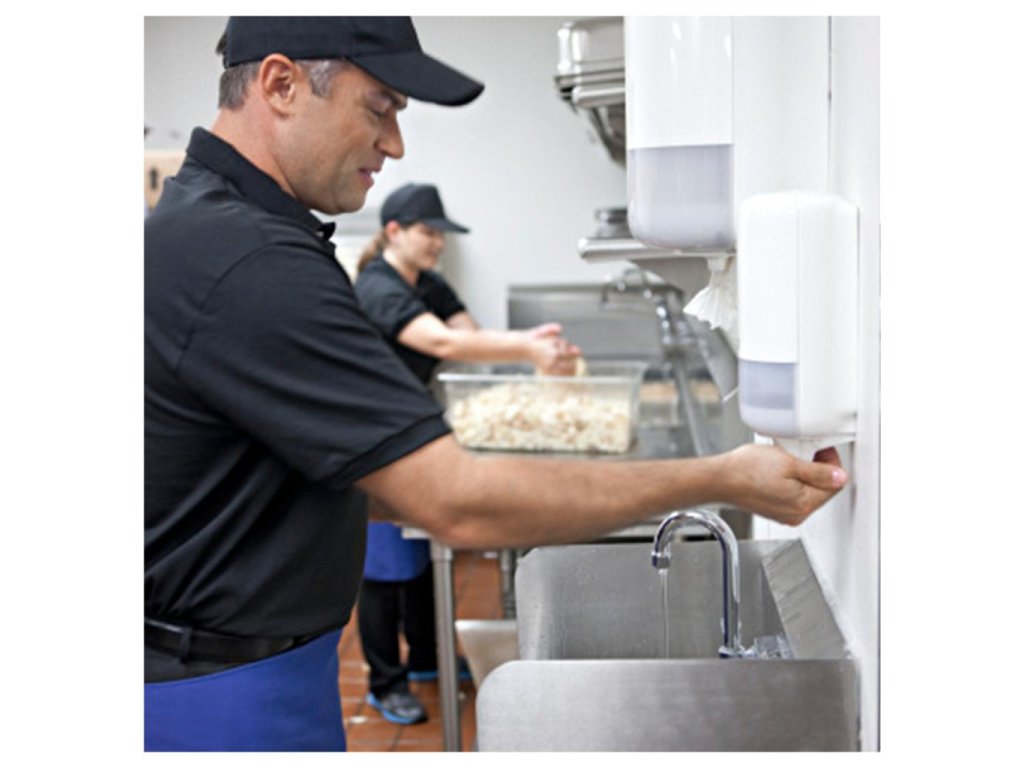 Z dávkovača vypusťte mydlo na mokré ruky, vytvorte penu, opláchnite a osušte jednorazovou papierovou utierkou.