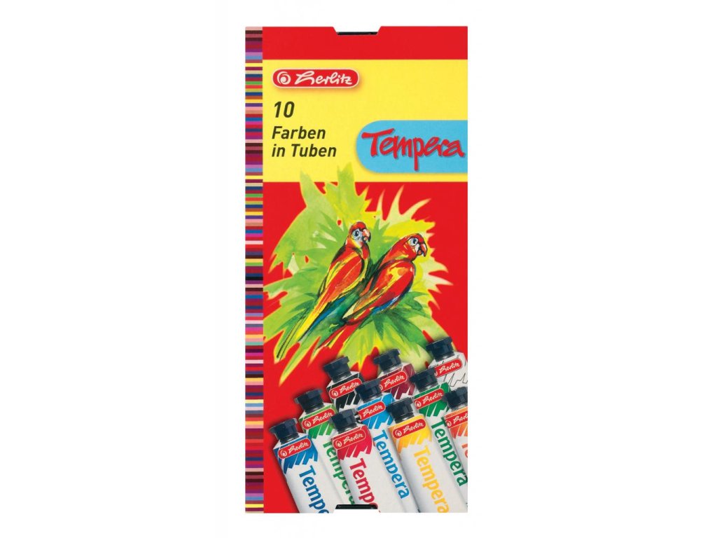Temperové farby, 10 kusov v 16 ml tubách. Farby:biela,žltá,oranžová,červená,bledomodrá,tmavomodrá,bledozelená,tmavozelená,hnedá,čierna, vo vode rozpustné, zmiešateľné. Balenie v krabičke.