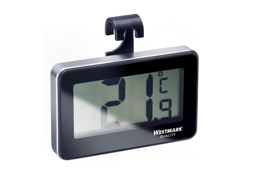 Digitálny teplomer do chladničky od spoločnosti Westmark. Na meranie izbovej teploty aj teploty v chladničke. Klip na zavesenie alebo postavenie. Prídavný magnet. Celkový rozsah teploty: -20 °C až +50 °C. WEEE Reg.č.: DE 813 850 81