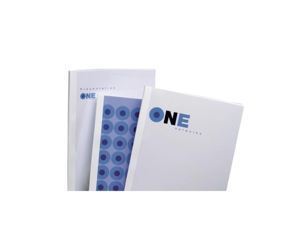 Priehľadné predné obálky z PVC s hrúbkou 150 mikrónov zaručujú jednoduchú čitateľnosť titulnej strany, zadné obálky z lesklého kartónu Silk White 240 g/m2 zaisťujú vysokú tuhosť