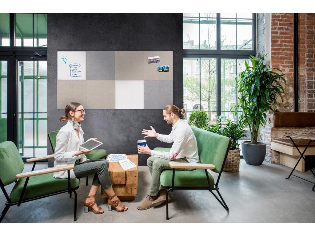 Bezrámová zvuk pohlcujúca nástenná tabuľa, ktorá zlepšuje akustiku v miestnosti. Jednoduchá montáž na stenu pomocou magnetických dosiek, hmoždiniek a skrutiek. Rozmer 75 x 50 cm. Farba sivá.