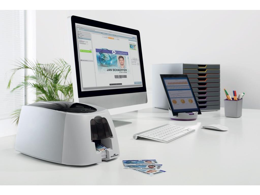 Možnosť rýchlej a jednoduchej čiernobielej alebo plnofarebnej potlače menoviek, identifi kačných, členských, vernostných a iných kariet vo fotokvalite. Karty ľahko vytvoríte pomocou voľne dostupného softvéru DURAPRINT® na PC aj MAC na www.duraprint.eu. Balenie obsahuje tlačiareň, farebnú pásku a 100 plastových kariet rozmerov 53,98 × 86,60 mm, príručku, napájací kábel, zdroj a USB kábel.