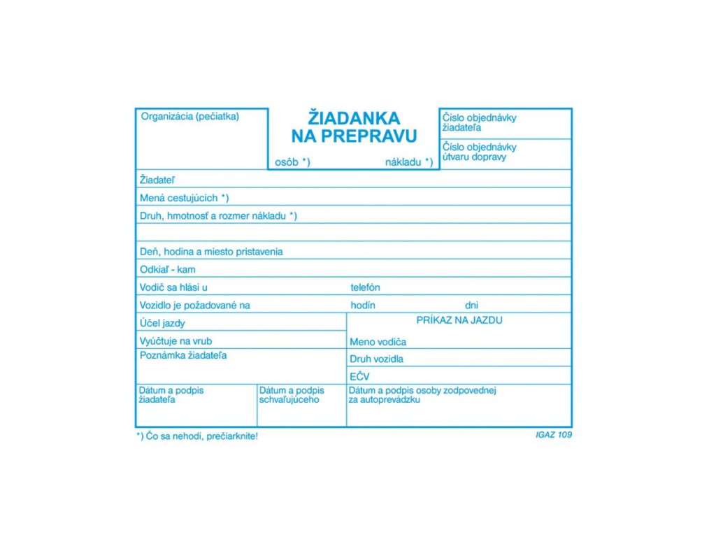 Dopravné tlačivo. Žiadanka na prepravu, A6, blok, 100 listov.