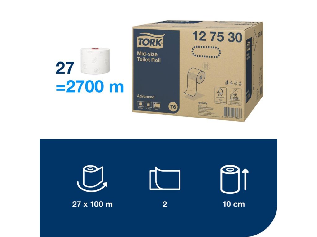 Dvojvrstvový biely toaletný papier z celulózy do zásobníkov Tork Mid-size, balený v kartóne po 27 ks. Dĺžka kotúča 100 m, priemer kotúča 13,2 cm.