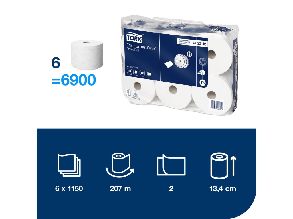 Tork SmartOne systém toaletného papiera v kotúči vydáva jeden hygienický list papiera naraz, čím pomáha znižovať spotrebu až o 40 % v porovnaní s tradičnými automatickými kotúčmi Jumbo. Tork SmartOne Mini sú vysokokapacitné kotúče, ktoré sú vhodné pre náročné toalety a umyvárne od nízkej, strednej až po vysokú návštevnosť v závislosti od toho, ktorý Tork SmartOne Mini zásobník si vyberiete. V predaji po balení (6 roliek).