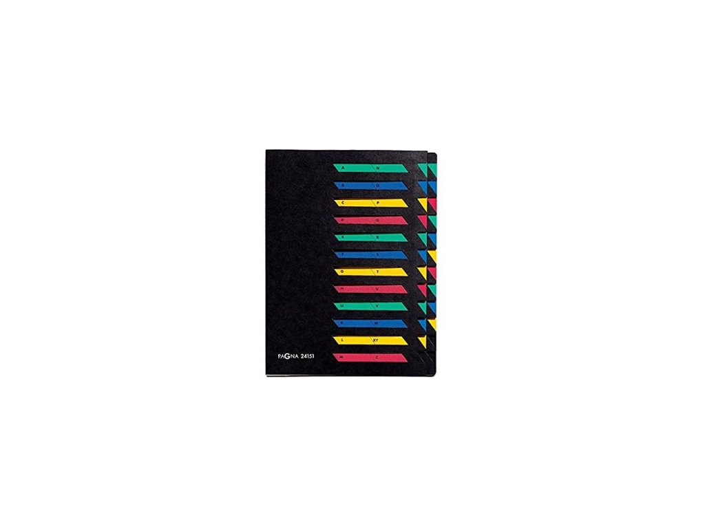24-dielna stolová triediaca kniha Pagna z pevného hladeného kartónu gramáže 450 g na číselné alebo abecedné triedenie. Farba vrchného obalu čierna. Otvory na titulnej strane na popis jednotlivých oddielov, jednotlivé oddiely farebne rozlíšené, rýchle otvorenie príslušného oddielu vďaka bočnému výseku, rozťahovateľný chrbát s veľkou kapacitou jednotlivých oddielov.