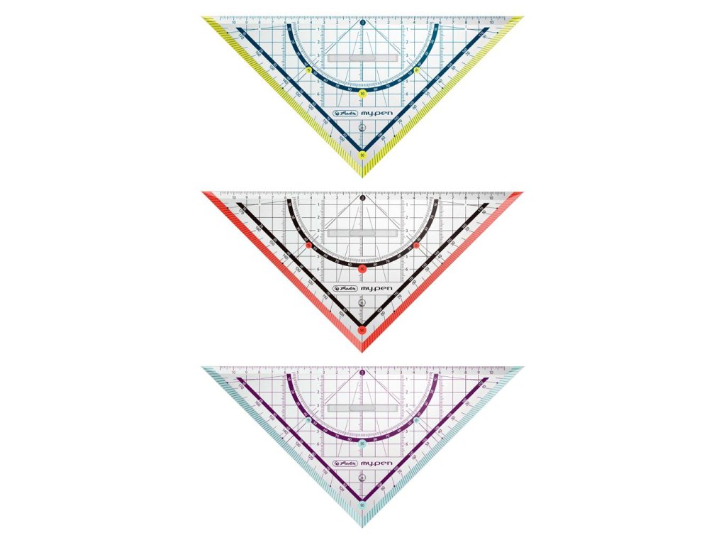 Trojuholník 25 cm s uhlomerom my. pen, plastový z nelámavého materiálu, s odnímateľným držiakom. Mix farieb.