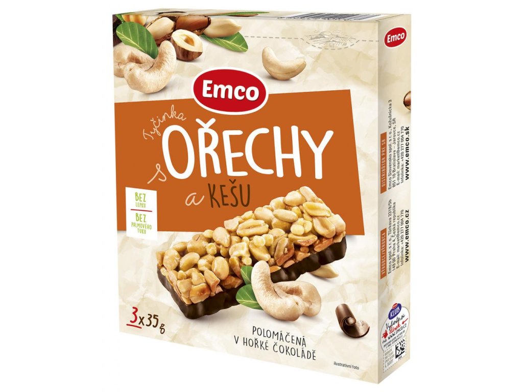Pražené ARAŠIDY 34%, pražené KEŠU ORECHY 24,8%, horká čokoláda 12% (cukor, kakaové maslo, kakaový prášok so zníženým obsahom tuku, kakaová hmota, emulgátor: repkový lecitín, vanilkový extrakt), invertný cukor (glukóza, fruktóza), maltózový sirup, extrudované cereálie (kukurica, ryža, cukor, soľ jedlá), dextróza, emulgátor: repkový lecitín, soľ jedlá.