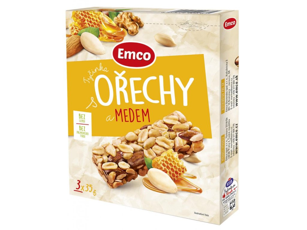Pražené ARAŠIDY 45%, pražené MANDLE 13,5%, invertný cukor (glukóza, fruktóza), maltózový sirup, pražené VLAŠSKÉ ORECHY 7%, extrudované cereálie (kukurica, ryža, cukor, soľ jedlá), med kvetový 2,7%, dextróza, emulgátor: repkový lecitín, soľ jedlá.
