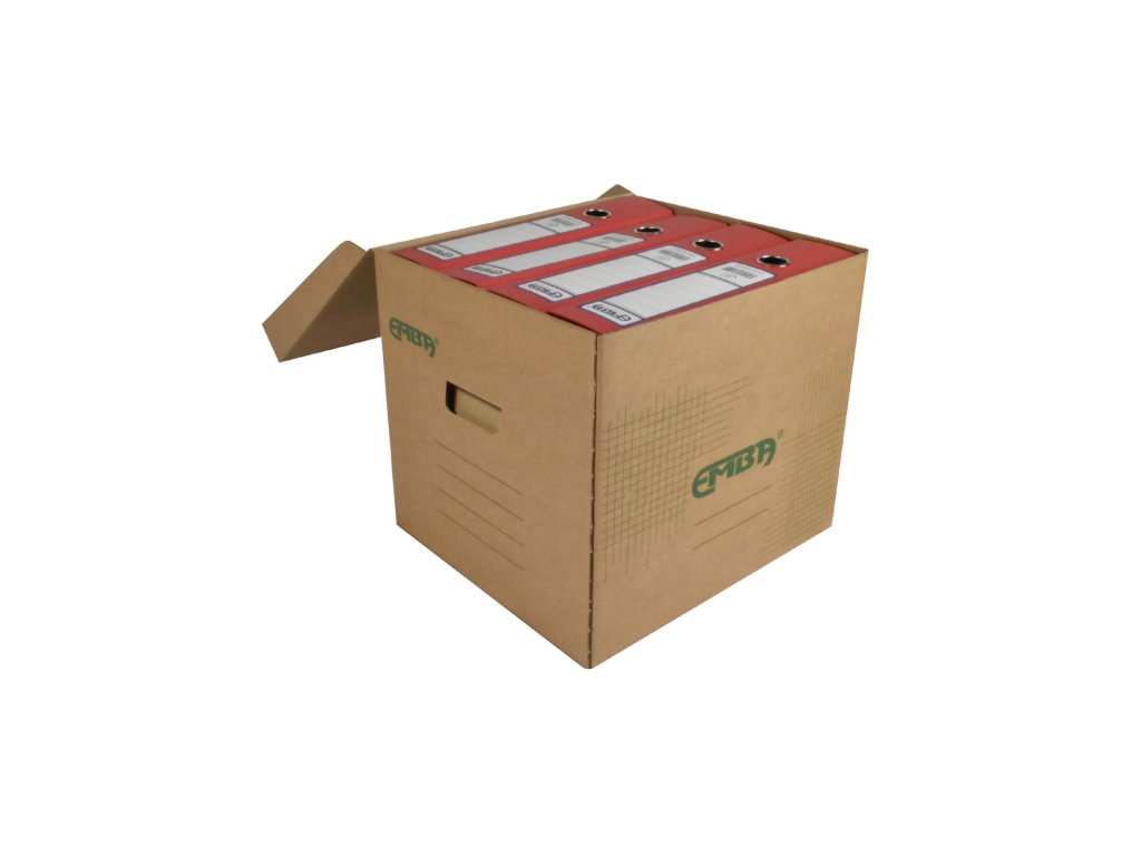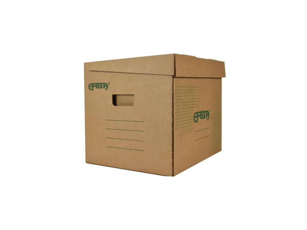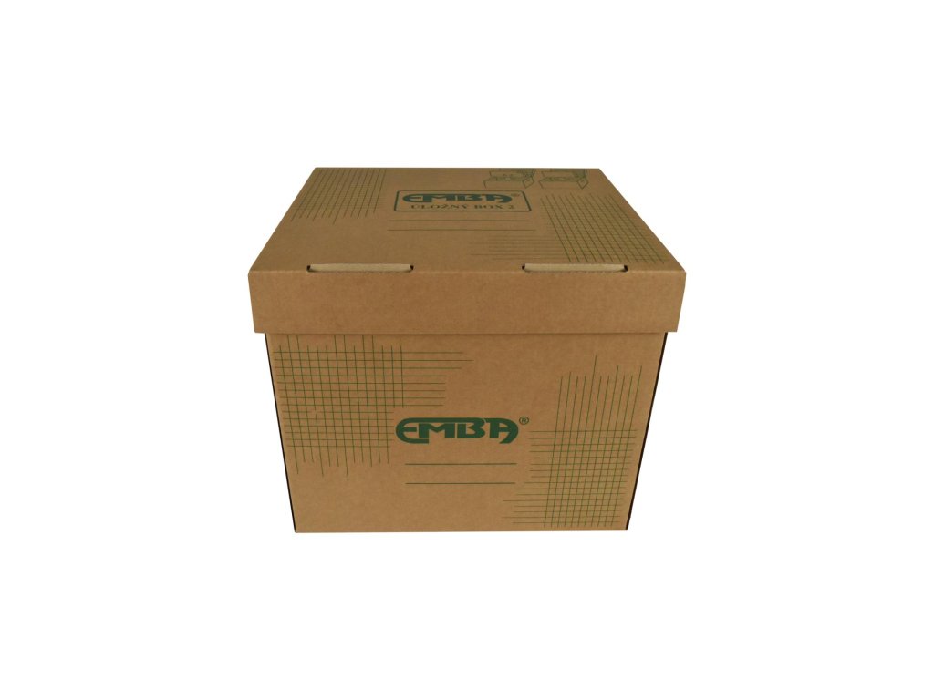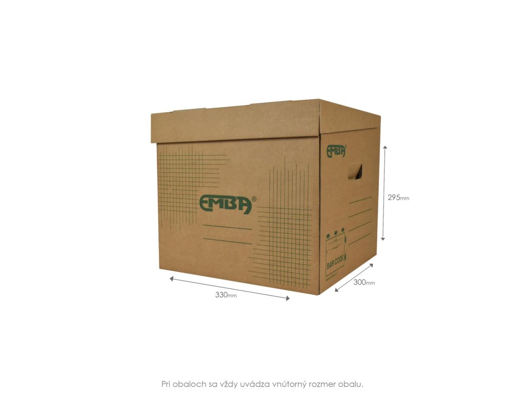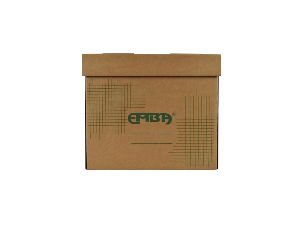 Úložná škatuľa vyrobená s výklopným vrchnákom z hnedej vlnitej lepenky. Určená na uloženie 4 ks zakladačov šírky chrbta 8 cm alebo archívnych boxov EMBA TYP I/75. Rozmery 330x300x295 mm.