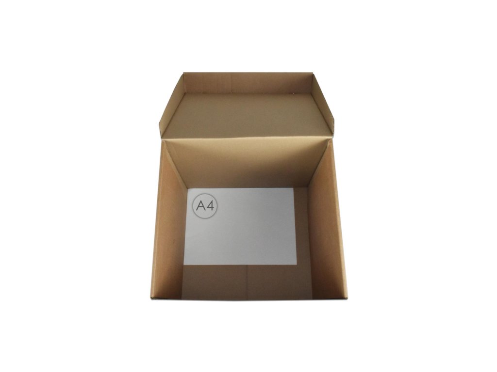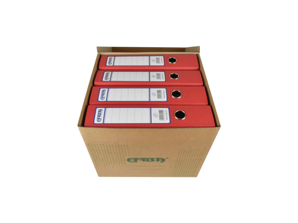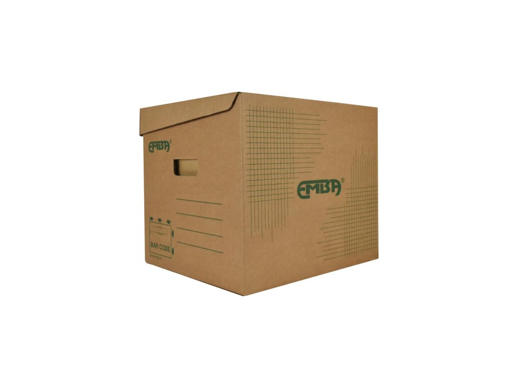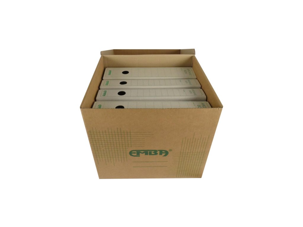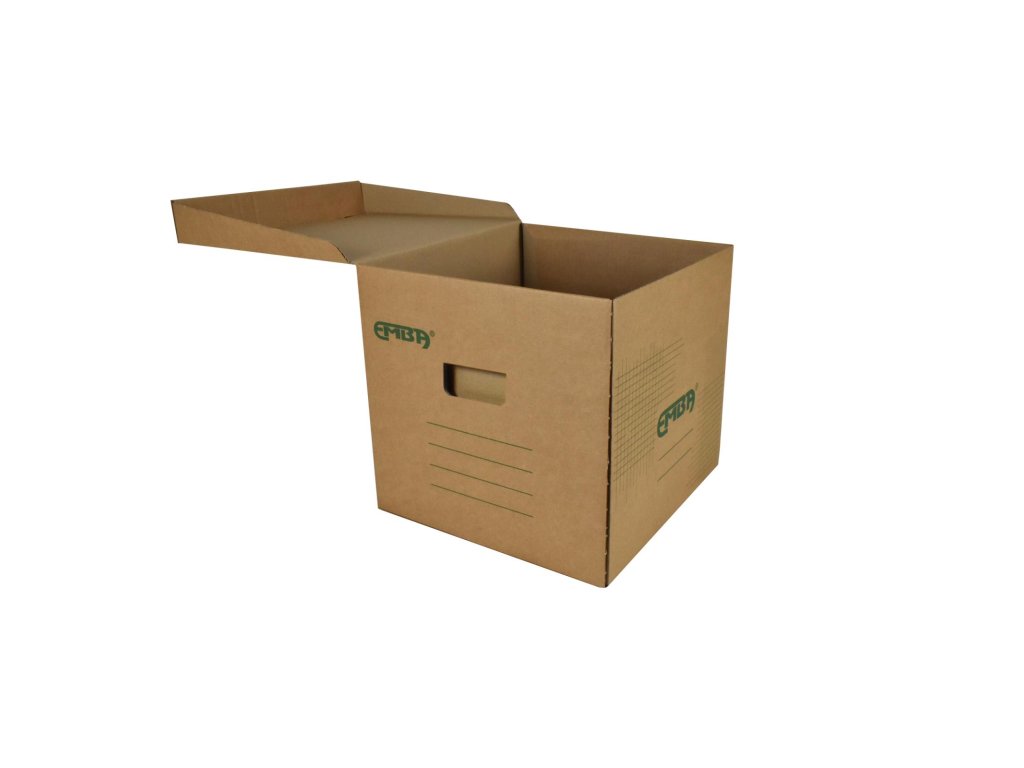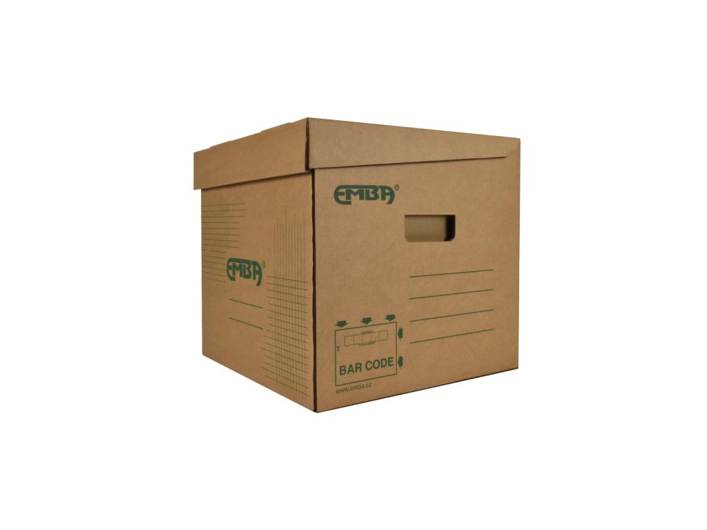 Úložná škatuľa vyrobená s výklopným vrchnákom z hnedej vlnitej lepenky. Určená na uloženie 4 ks zakladačov šírky chrbta 8 cm alebo archívnych boxov EMBA TYP I/75. Rozmery 330x300x295 mm.