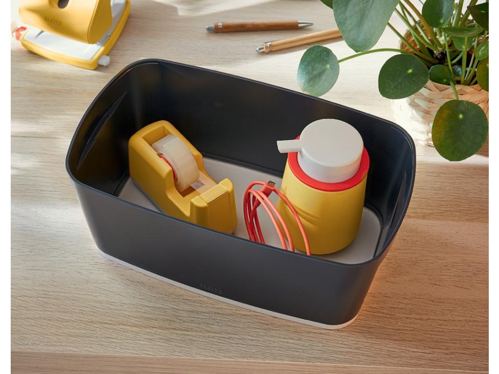 Výnimočne pevný box s vekom z modulárneho systému Leitz MyBox® z kvalitného materiálu. Dvojfarebné prevedenie a lesklý povrch vytvárajú unikátny dojem. Je určený na rýchle uskladnenie dokumentov a ďalších predmetov. Odolný voči poškriabaniu a vodotesný, s guľatými rohmi pre jednoduché čistenie. Nenápadný okraj drží veko v zavretej pozícii a pritom sa ľahko otvára. Pri nepoužívaní je možné viaceré boxy stohovať na seba a šetriť tak miesto. Box dobre dopĺňa ostatné produkty najmä dvojfarebného radu WOW. Rozmery 318 × 191 × 128 mm. Objem 5 litrov.