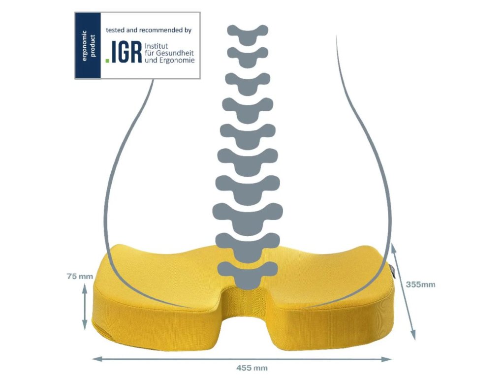 Vankúš je nvrhnutý tak, aby podporoval zdravé držanie tela, zlepšoval krvný obeh a zmierňoval tlak na chrbticu, čím pomáha výrazne znížiť nepohodlie, únavu a stuhnutosť. Tento štýlový ortopedický vankúš na sedenie s minimalistickým dizajnom a matnými farbami zlepší zdravie a pohodu tým, že bez námahy vytvorí dokonalé aktívne (pracovné) prostredie pre každého. Ručne prateľný látkový poťah. Farba žltá.