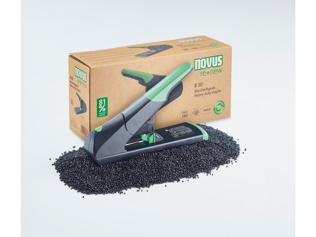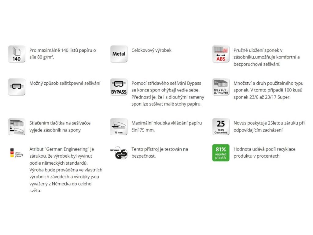Veľkokapacitná zošívačka pre profesionálne použitie z kolekcie šetrnej k životnému prostrediu re+new. Kapacita súčasne zošitých listov až do 140 listov. Celokovová s plastovým krytom. Systém ABS pre bezproblémové zošívanie bez zaseknutia spiniek. vrchná časť je z 81% recyklovaného plastu. Kapacita náplne 100 spiniek 23/6 až 23/17 Super. Hĺbka zošívania 7,5 cm. Hmotnosť 1460 g. Záruka 25 rokov. Farba čierna.