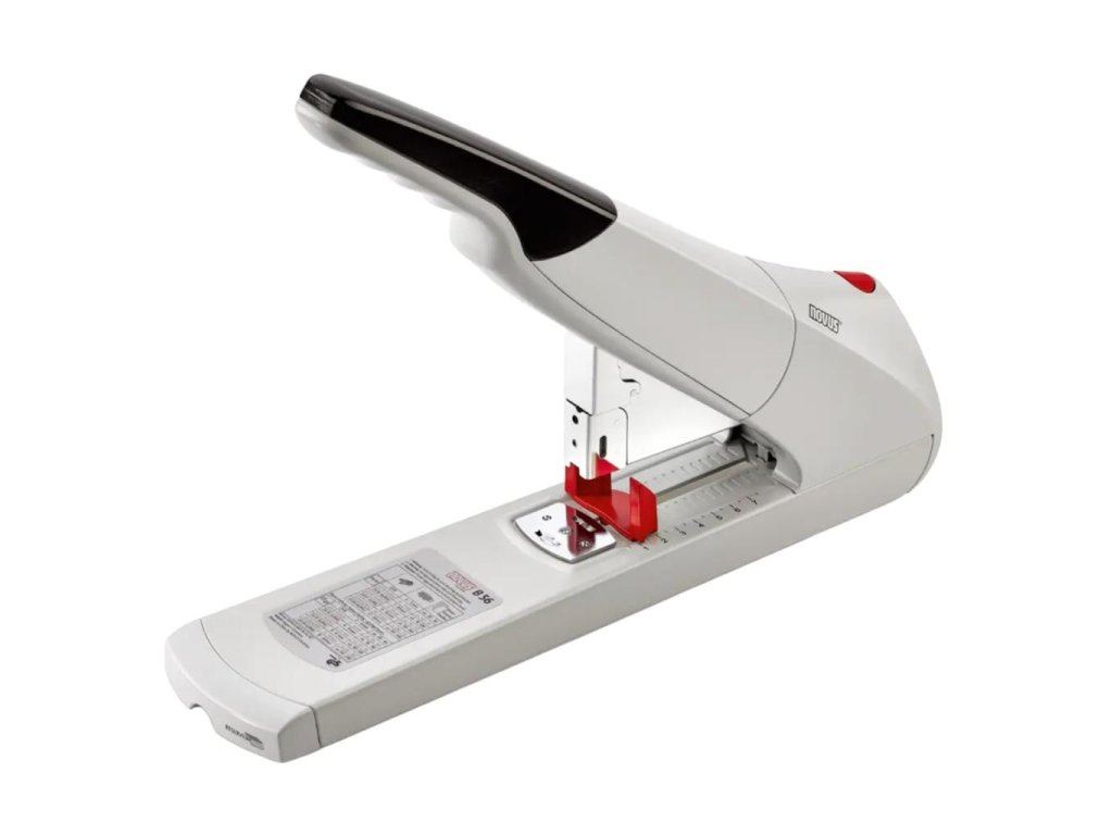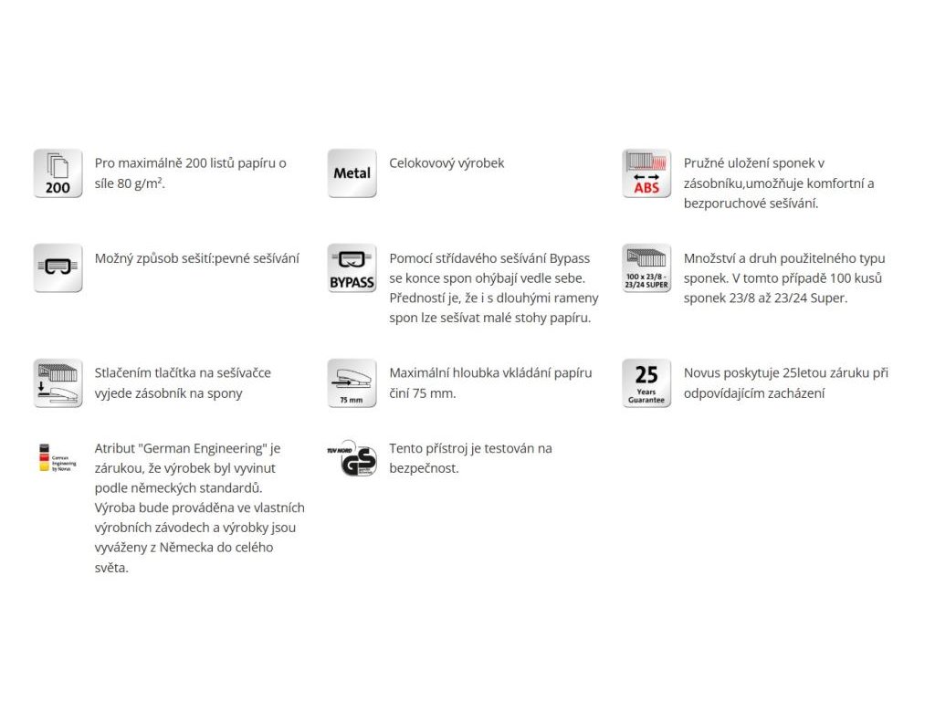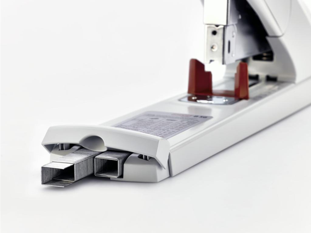 Extrémne silná celokovová veľkokapacitná zošívačka s plastovým telom. Kapacita zošívania do 210 listov, vybavená anti blokovacím ABS systémom pre bezproblémové zošívanie. Kovový zásobník s dvojitým vedením spiniek. Systém „bypass“ umožní použitie iba jednej veľkosti spiniek tým, že spinku ohne do bokov. Kapacita náplne 100 spiniek 23/ 8 až 23/ 24 SUPER. Variabilná hĺbka zošívania do 7,5 cm. Hmotnosť cca 2 100 g. Záruka 25 rokov. Farba sivá.