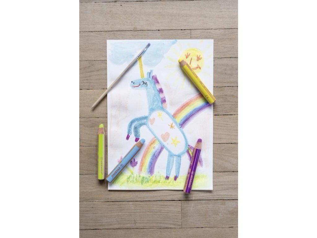 STABILO Woody 3 v 1 je multifunkčná farbička, vodovka a voskovka v jednom, ktorá vie kresliť na papier, na tmavý podklad, kartón, sklo, kov, drevo alebo trebárs aj na gumáky. Ozdobiť si drevený rámik, okno, chlebník alebo plechovku na ceruzky je hračka. Deti ju milujú a rodičia môžu zostať v pokoji, pretože farbu možno z ručičiek aj z hladkého povrchu dobre zmyť vodou s mydlom alebo saponátom. Tuha obsahuje osemkrát viac farby než bežná farbička, nemožno ju zlomiť a hodí sa na extra dllllllllhé kreslenie a na veľké umelecké diela: vďaka hrubej tuhe je možné všetko rýchlo vyfarbiť. Vďaka svojmu tvaru padne woody výborne do detskej ručičky. K dostaniu je 18 atraktívnych farieb, vrátane zlatej a striebornej. Zakúpiť sa dá v baleniach alebo jednotlivo. XXL tuha je uložená v tele, ktoré je vyrobené z dreva certifikovaného PEFC® (PEFC/04-31-1728) a je teda šetrná k životnému prostrediu.