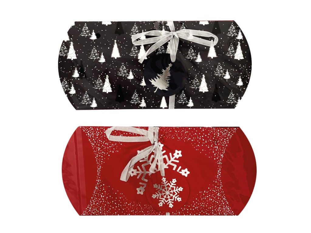 Papierová darčeková krabička pukačka 220x100mm 2 ks mix vianočných motívov. Previazané stuhou s visačkou, elegantný dizajn vhodný na každú príležitosť. Ideálne na balenie malých darčekov, ako sú šperky, darčekové poukážky.