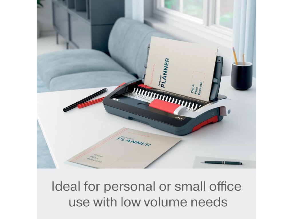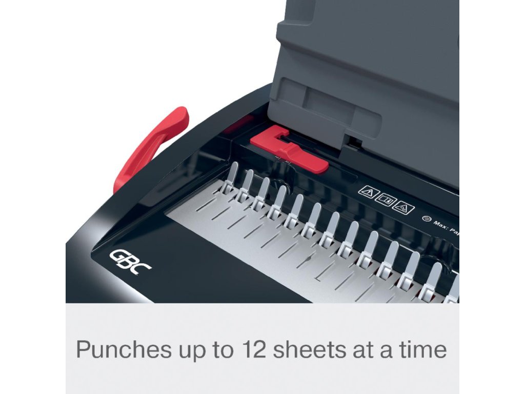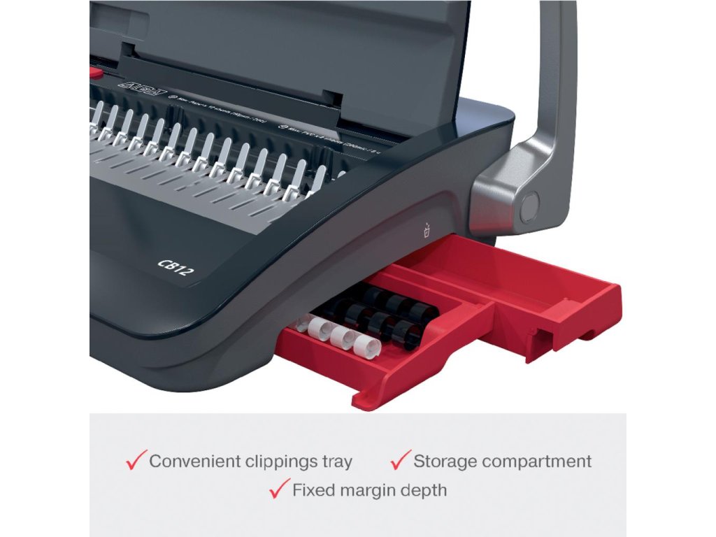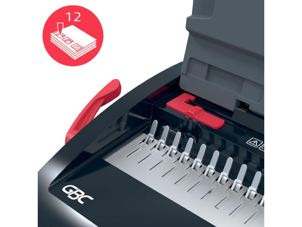 CombBind® CB12 je spoľahlivý a kompaktný ručný viazač vhodný na domáce použitie alebo do malých kancelárií s nízkym objemom väzby. Ľahko prederaví až 12 listov papiera A5/A4 s gramážou 80 g/m² a zviaže až 165 listov naraz pomocou chrbtov s priemerom 19 mm. Vďaka ľahkej a priestorovo úspornej konštrukcii ho možno používať kdekoľvek a kedykoľvek a jednoducho uložiť, keď sa nepoužíva. Pre väčšie pohodlie je vybavený zásobníkom na odrezky pre jednoduché vysypanie a praktickým úložným priestorom. Univerzálna väzba: jednoducho zviažete dokumenty formátu A5 pomocou chrbátov A5 a strany formátu A4 na výšku pomocou chrbátov A4. Ručné dierovanie s jednou pákou pre jednoduché a plynulé viazanie. Ľahká a kompaktná konštrukcia pre jednoduché prenášanie a pohodlné uloženie. Čierna a strieborná farba.