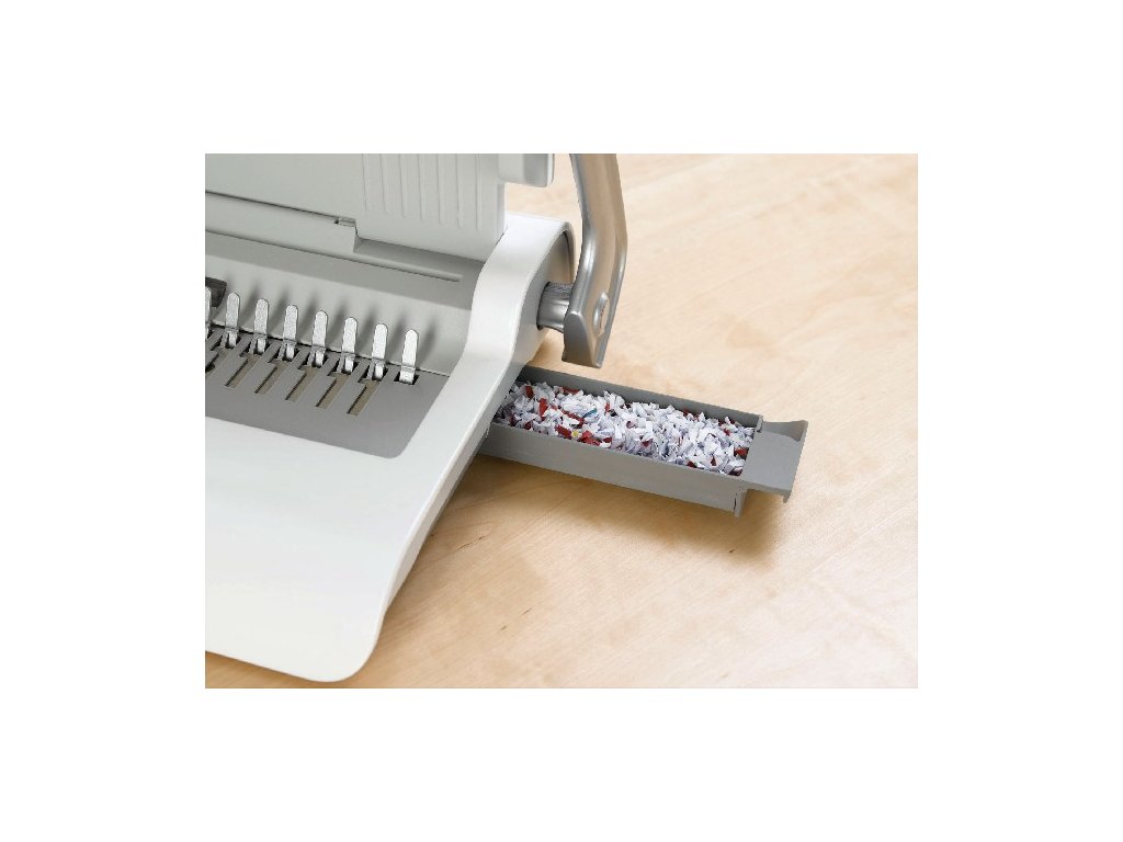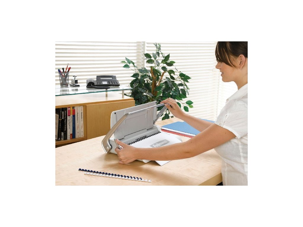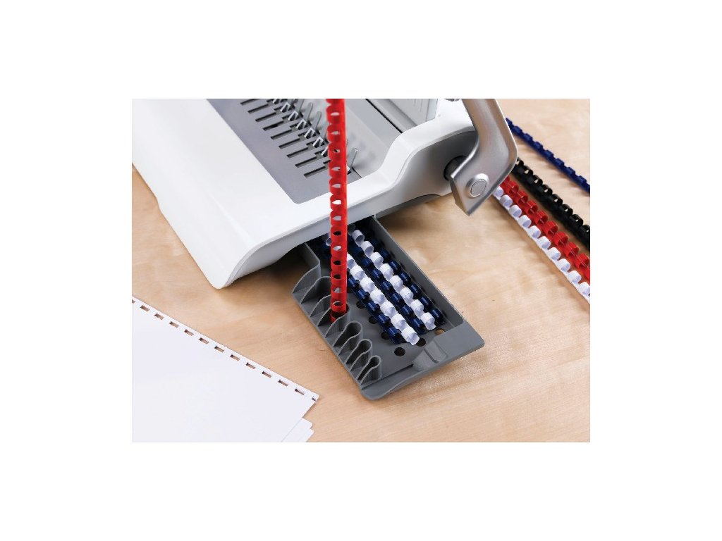 Malé manuálne viazacie zariadenie, ideálne do domácich alebo malých kancelárií s občasným použitím. Elegantný a pevný dizajn s možnosťou vertikálneho zloženia pre šetrenie s pracovným miestom pri nepoužívaní.Súčasne predieruje maximálne 10 listov papiera A4 80 g. Zviaže do 150 listov 80 g papiera (priemer hrebeňa 6 až 18 mm).