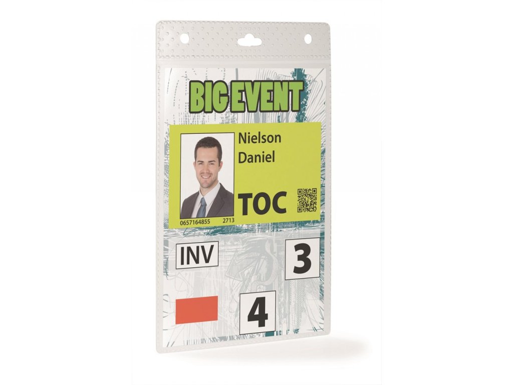Visačka z PP s perforáciou na uchytenie. Ideálna na vybavenie väčšieho počtu osôb na konferenciách, výstavách a pod. Dodávaná spolu s etiketou formátu A6. Použiteľná s textilným remienkom, výsuvným kotúčom alebo retiazkou. Balenie 20 kusov. Vnútorný rozmer: š105xv148mm
