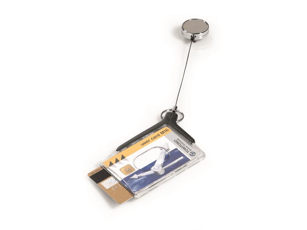 Kombinácia elegancie a bezpečnosti - elegantná, priehľadná akrylová visačka na dve plastové karty, použiteľná horizontálne alebo vertikálne. Dodávaná s chrómovaným výsuvným kotúčom a kovovým klipom na rubovej strane. Rozmery 85 x 54 mm. V balení 10 ks.