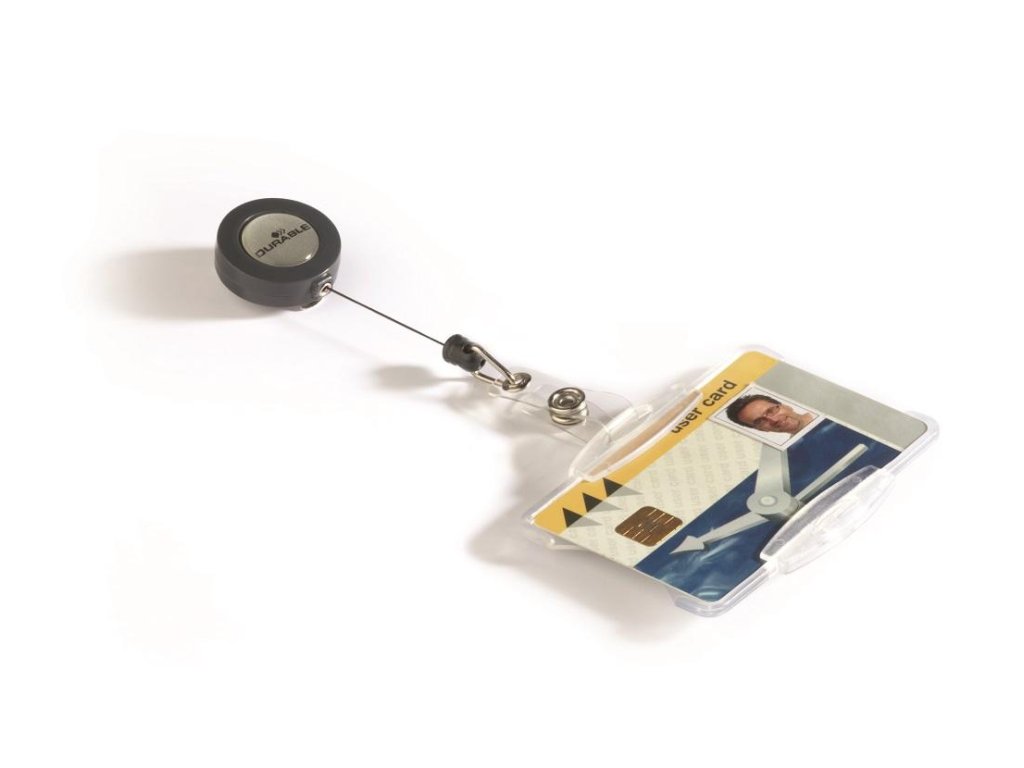 Plastová visačka na jednu plastovú identifikačnú kartu z priehľadného pružného plastu vysokej kvality, z prednej strany otvorená. Vhodná na ochranu magnetických a bezpečnostných kariet pred poškodením. Uchytenie klipu na kratšej alebo dlhšej strane poskytuje univerzalitu pri použití horizontálne alebo vertikálne označených kariet. Výsuvný kotúčik čiernej farby s kovovým klipom s možnosťou vysunutia do 80 cm. Balenie 10 ks.