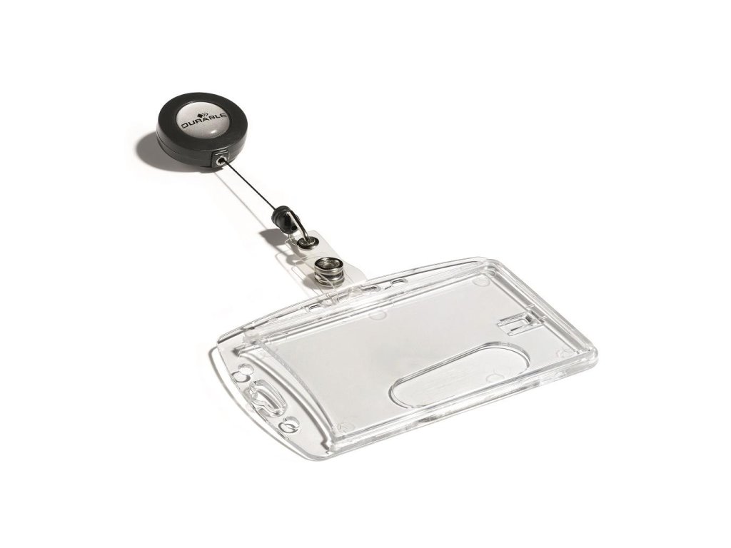 Visačka na jednu plastovú identifikačnú kartu z priehľadného plastu, ktorý chráni kartu pred poškodením. S otvorom na palec na rýchle a jednoduché vysunutie karty. Plastová visačka s výsuvným kotúčikom čiernej farby s kovovým klipom a možnosťou vysunutia do 80 cm. Balenie 10 ks.