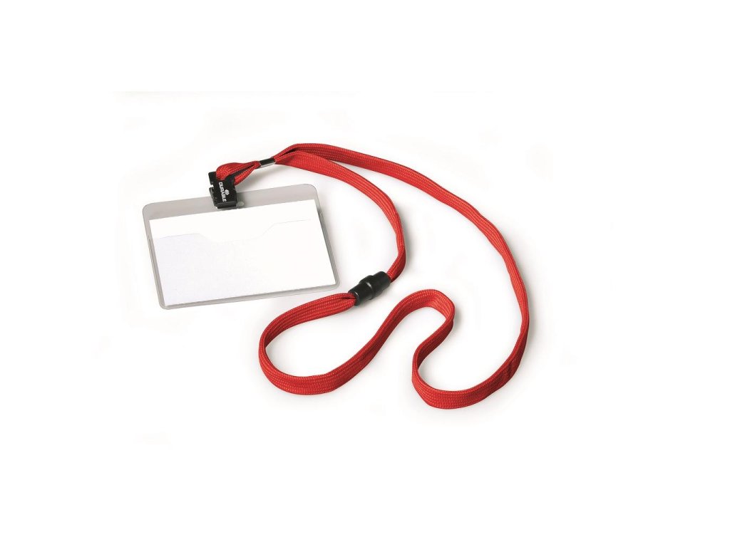 Visačka na krk s farebným bezpečnostným remienkom dĺžky 44 cm. Poistka na remienku sa uvoľní pri zachytení remienka alebo silnom potiahnutí. Materiál pevné priehľadné PVC, závesný remienok šírky 10 mm. Balenie 10 ks. Náhradné papieriky DU145602.