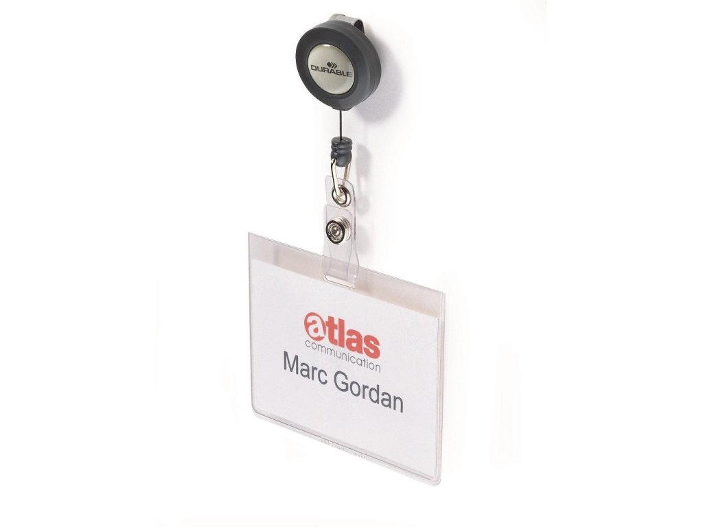 Visačka z pevného priehľadného PVC s vysúvacím kotúčom s možnosťou vysunutia do 80 cm. Po uzavretí remienka nie je možné menovku vyberať. Dodávaná s papierovou menovkou. Náhradné papieriky DU145602. Balenie 10 ks.