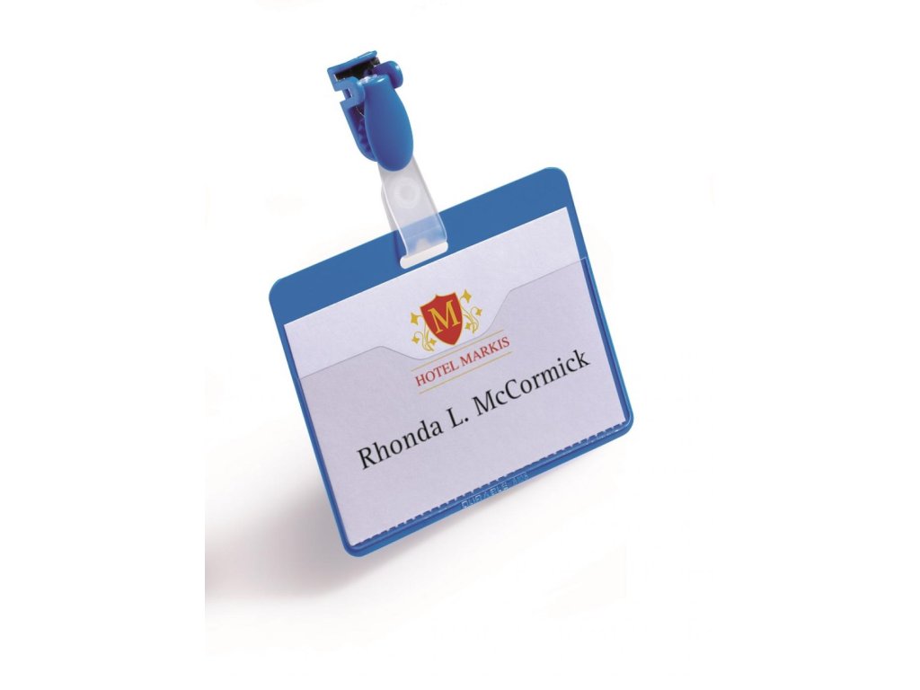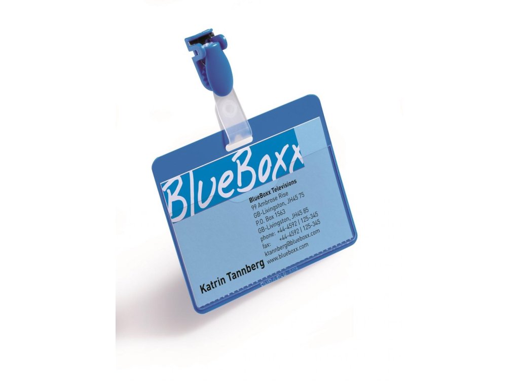 Priehľadná visačka s európskym štipcom, umiestneným na dlhšej strane visačky. Dodávané s papierovými kartičkami rozmerov 90 × 60 mm. Model, pri ktorom možno menovku vyberať bez potreby odnímania štipca s remienkom. Farba modrá. Balenie 25 ks.