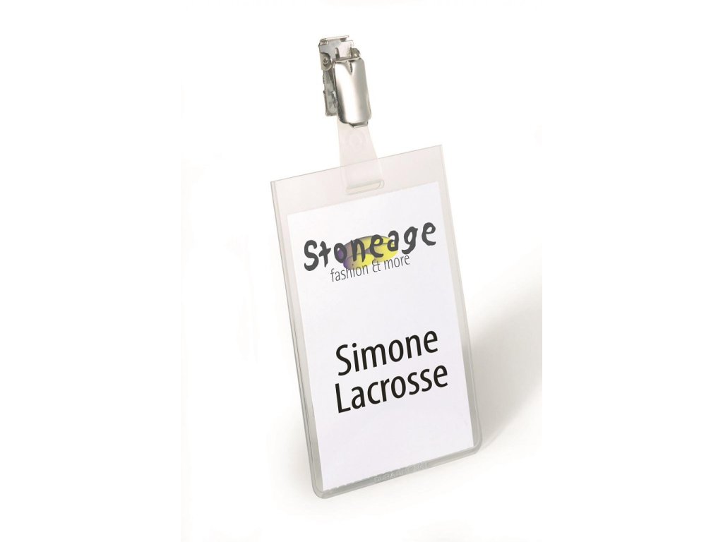 Priehľadná visačka s európskym štipcom, umiestneným na kratšej strane visačky. Dodávaná s papierovou kartičkou rozmerov 90×60 mm. Model, pri ktorom po uzavretí štipca nie je možné menovku vybrať. Náhradné papieriky obj. kód DU145702. Balenie 25 ks.
