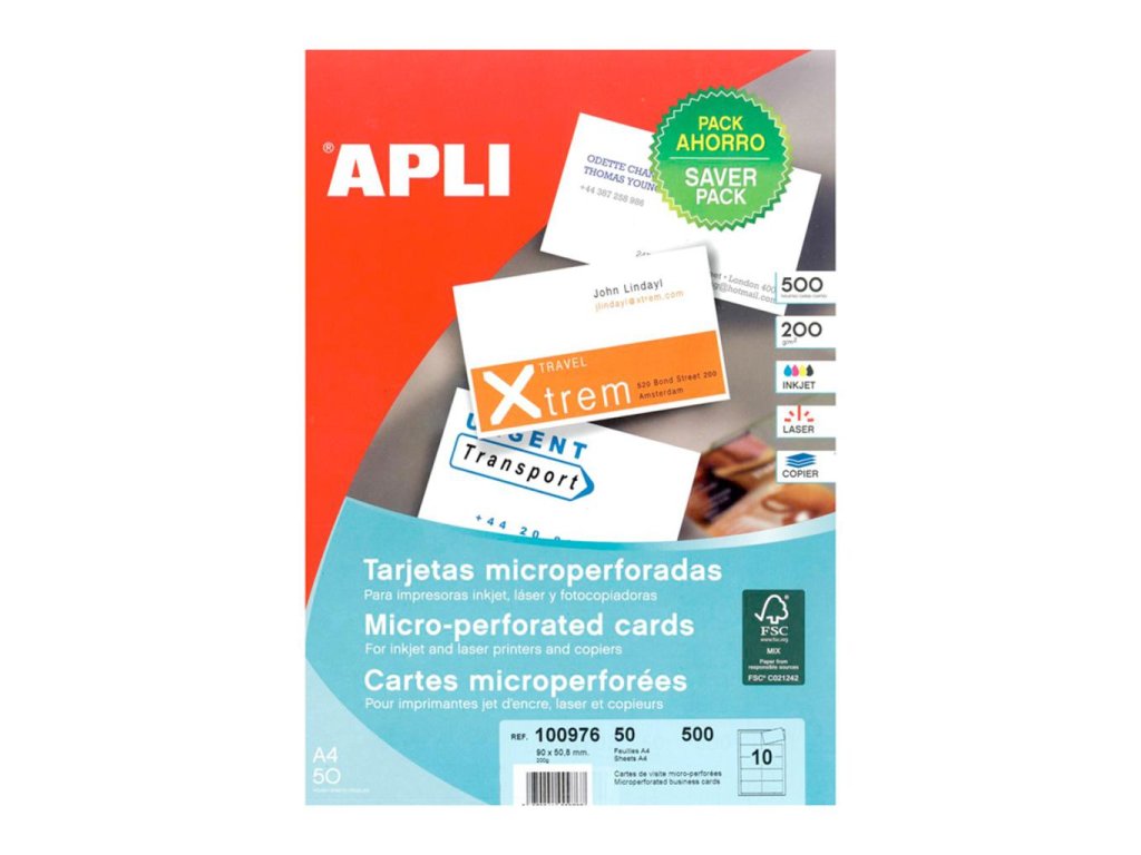 Hárky kvalitného bieleho papiera, určené na výrobu 10 vizitiek veľkosti 90 × 50,8 mm z jedného hárku A4. Mikroperforácia umožňuje po tlači jednotlivé vizitky z papiera oddeliť. Pri detailnom pohľade vidieť jemne vrúbkovaný okraj vizitky. Vhodné do atramentových a laserových tlačiarní a kopíriek. Papier na 500 vizitiek.