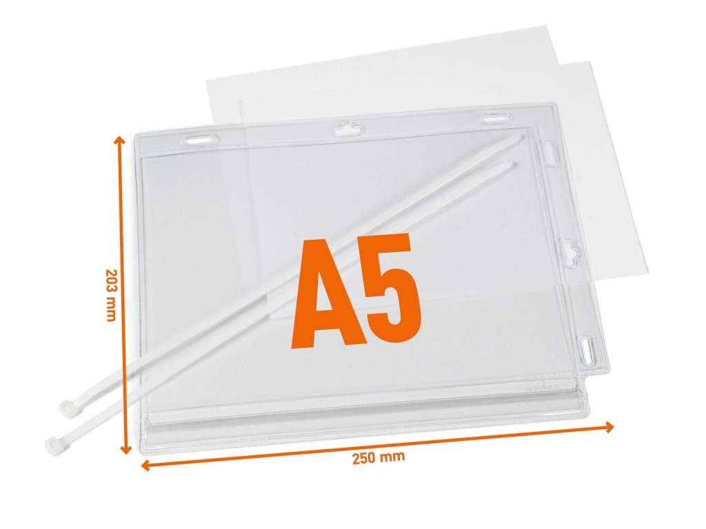 • Vodeodolné vrecko formát A5 je ideálne na zobrazovanie informácií v exteriéri, ako sú záhradné centrá, sauny, bazény, brány a nástenky, kde upozornenia prichádzajú do kontaktu so striekajúcou vodou.