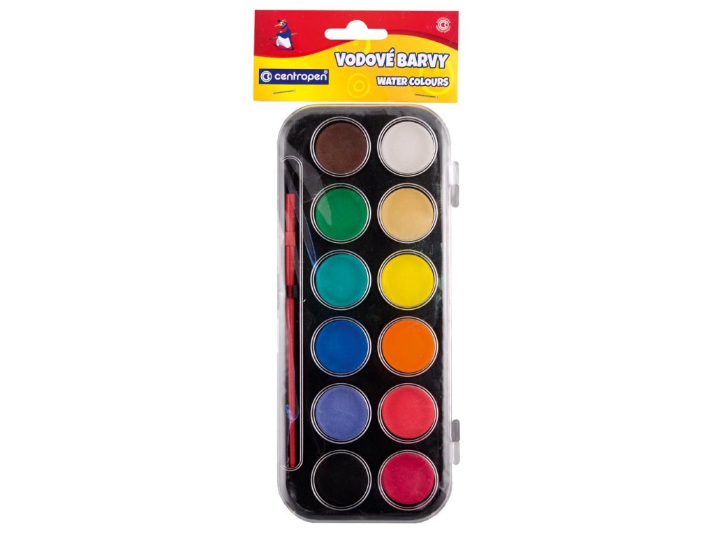Vodové farby Centropen 9540 so štetcom. 12 farieb o priemere 30 mm.