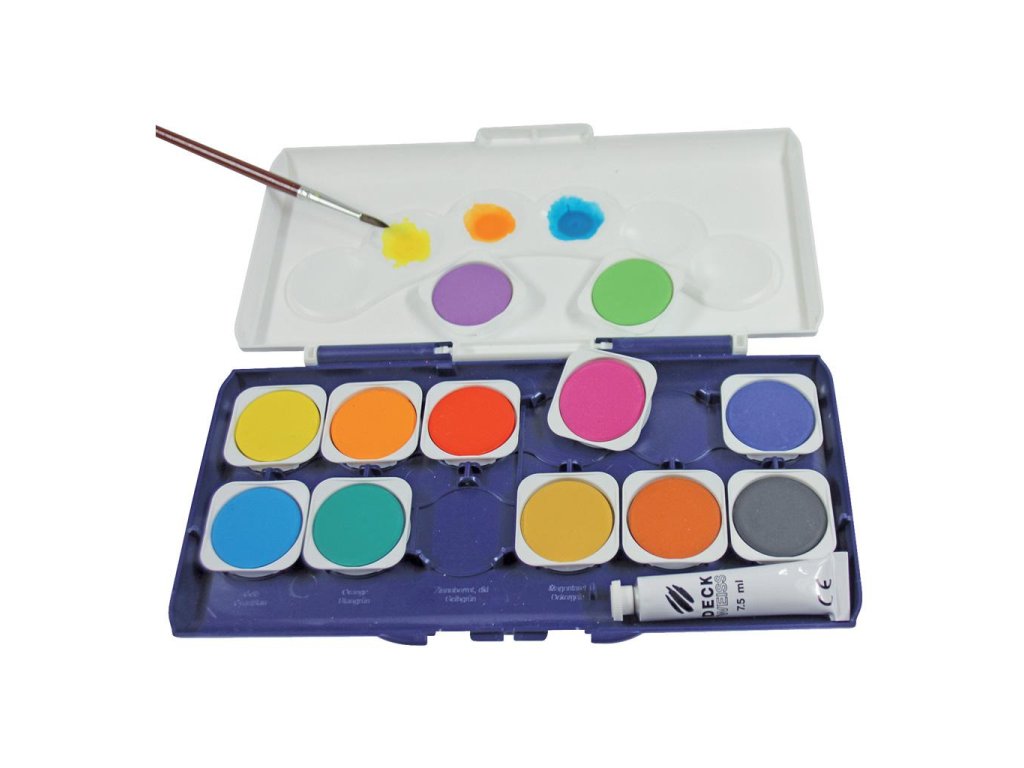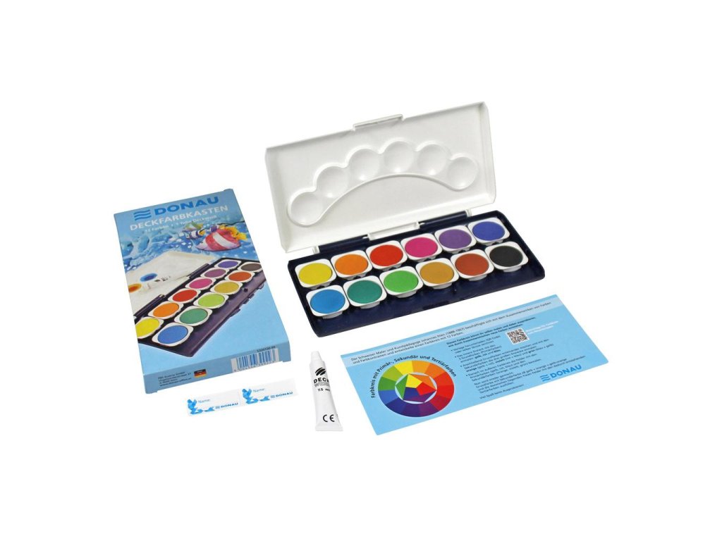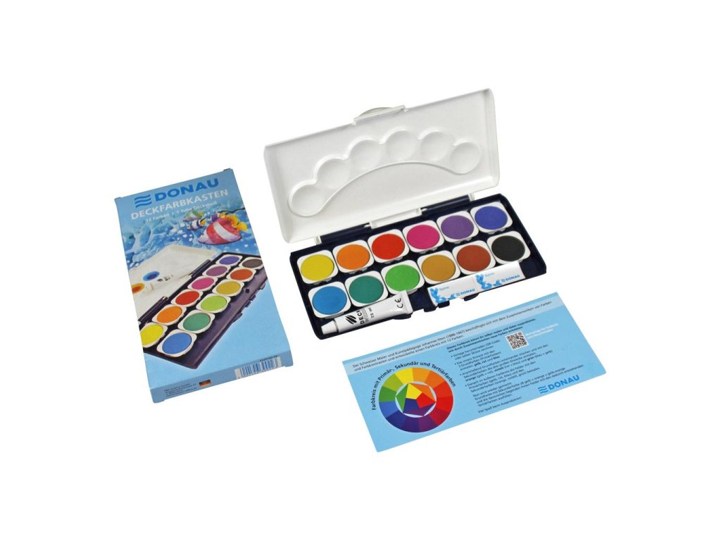 Vodové farby Donau, 12 farieb, vrátane nepriehľadnej bielej. Vyberateľné misky, paleta na miešanie farieb.