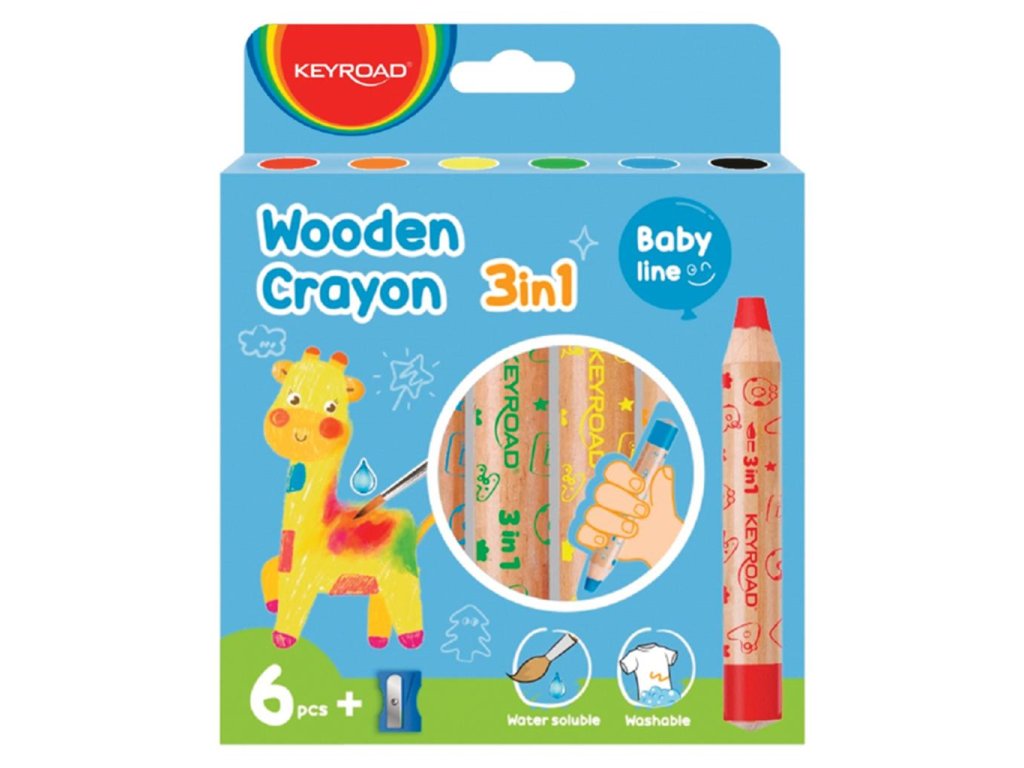 Voskové vodové pastelky v drevenom puzdre. Vysokokvalitné JUMBO pastelky na báze vosku a vodových farieb, ideálne pre malé deti. Funkcie: 3 v 1 voskové pastelky rozpustné vo vode, 6 kusov + strúhadlo.